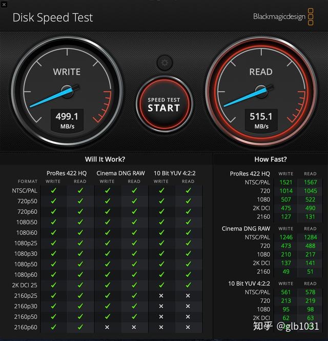 在MAC系统下,接入系统后就可以看到弹出一个移动存储设备在桌面了。通过MAC下的Disk Speed Test测试可以看到读取515.1MB/s,写入499.1 MB/s。