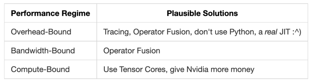 在训练机器学习模型的时候,知道你遇到的是哪类问题非常关键,使模型高效的问题也是如此。例如,当模型花费大量时间进行内存到 GPU 的转移的时候(也就是内存带宽紧张的时候),增加 GPU 的 FLOPS 就不管用。另一方面,如果你正在运行大量的矩阵乘法运算(也就是计算紧张的时候),将你的程序重写成 C++ 去减轻额外开销就不会管用。