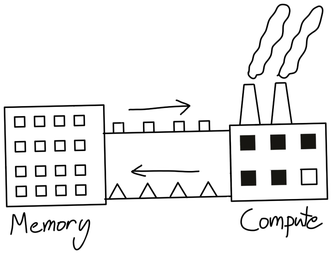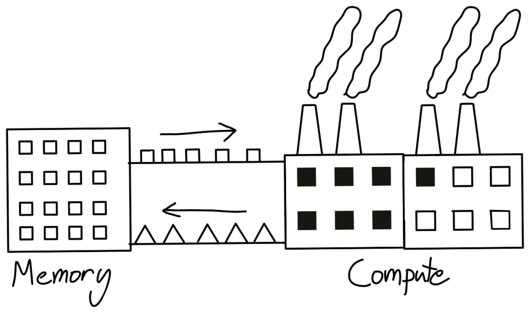 一种理解计算的方式是把它想象成工厂。我们把指令传达给我们的工厂(额外消耗),把原始材料送给它(内存带宽),所有这些都是为了让工厂运行得更加高效(计算)。