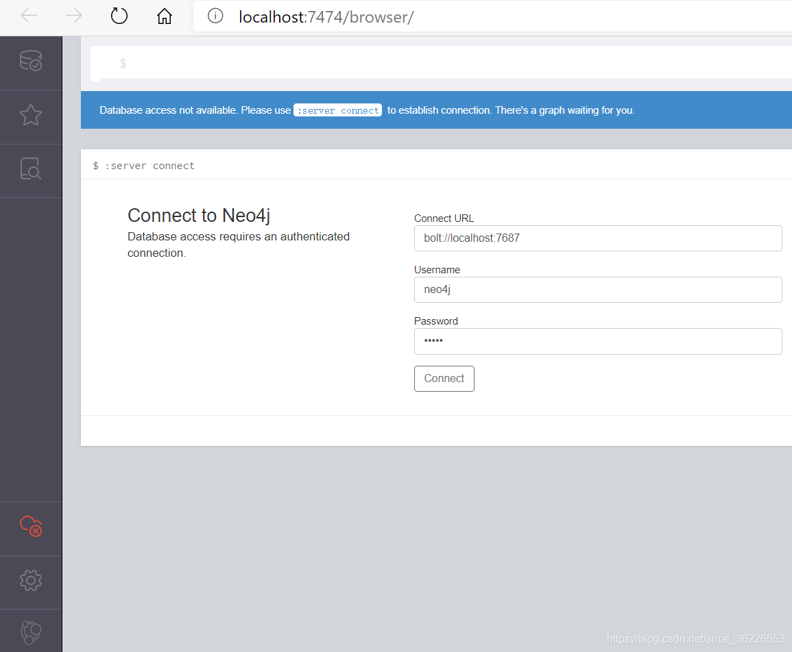 在浏览器 http://localhost:7474 中查看Neo4j数据库 (默认的host是bolt://localhost:7687,默认的用户是neo4j,其默认的密码是:neo4j,第一次成功登陆到Neo4j服务器之后,需要重置密码