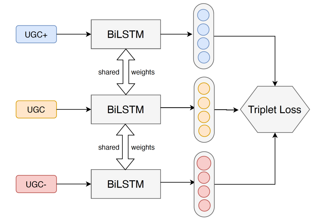 为了解决关系抽取任务中的冷启动问题,业界通常采用Bootstrapping的方法,通过人工设定的少量种子和模板,自动从语料中扩充数据。然而,Bootstrapping方法不仅受限于模板的质量,而且应用于美团的场景中有着天然缺陷。美团语料的主要来源是用户评论,而用户评论的表述十分口语化及多样化,很难设计通用而且有效的模板。因此,我们抛弃基于模板的方法,而是根据实体间的共现特征以及类目特征,构建了一个三元对比学习网络,自动从非结构化的文本中挖掘实体关系之间潜在的相关性信息。