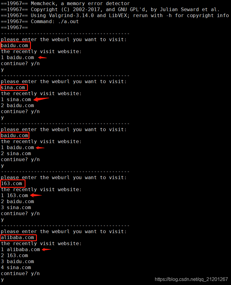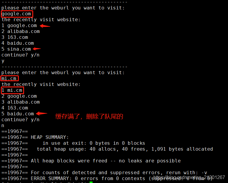 {char conti = 'y';size_t maxCacheSize = 5;string web;webList cacheList;while(conti == 'y' || conti == 'Y'){cout << "-------------------------------------------" << endl;cout << "please enter the weburl you want to visit: " << endl;cin >> web;weburl *tempNode = cacheList.find(web);weburl *head = cacheList.get_head();if (tempNode == NULL) //没有找到,是新的访问记录{weburl *newWeb = new weburl;newWeb->website = web;newWeb->next = NULL;if (cacheList.getCacheSize() < maxCacheSize) //存储没满,直接加到队首{cacheList.push_front(newWeb);} else //存储满了,删除队尾,插入新的到队首{cacheList.pop_back();cacheList.push_front(newWeb);}} else //从已有的数据中找到了记录{if (tempNode == head) ; //记录在第一条,则无需操作else {weburl *mvRecord = tempNode->next;tempNode->next = mvRecord->next; //把该记录从链表中断开cacheList.move_to_front(mvRecord); //把该记录移到队首}}cacheList.printCacheList();cout << "continue? y/n" << endl;cin >> conti;cin.get();}return 0;