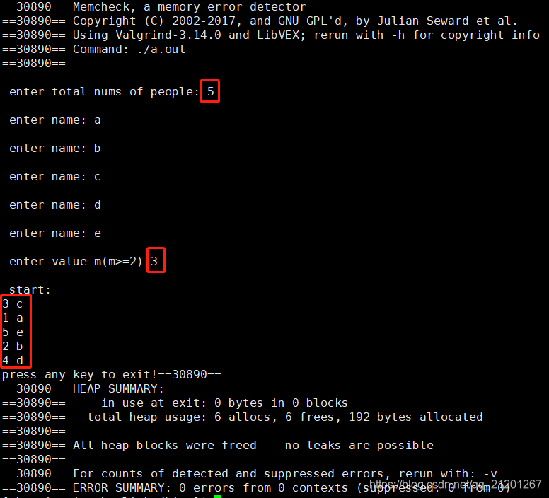 {int m,i;NodeType *del = p_head, *tempNode;cout << "\n enter value m(m>=2):";cin >> m;cout << "\n start:" << endl;while(del->next != del) //链表节点个数不为1{for(i = 1; i < m; ++i) //del往后移动m位{tempNode = del;del = del->next;}cout << del->num << " " << del->name << endl;tempNode->next = del->next; //断开del节点delete del; //释放del节点del = tempNode->next;}cout << del->num << " " << del->name << endl;delete del; //链表只剩一个节点直接删除