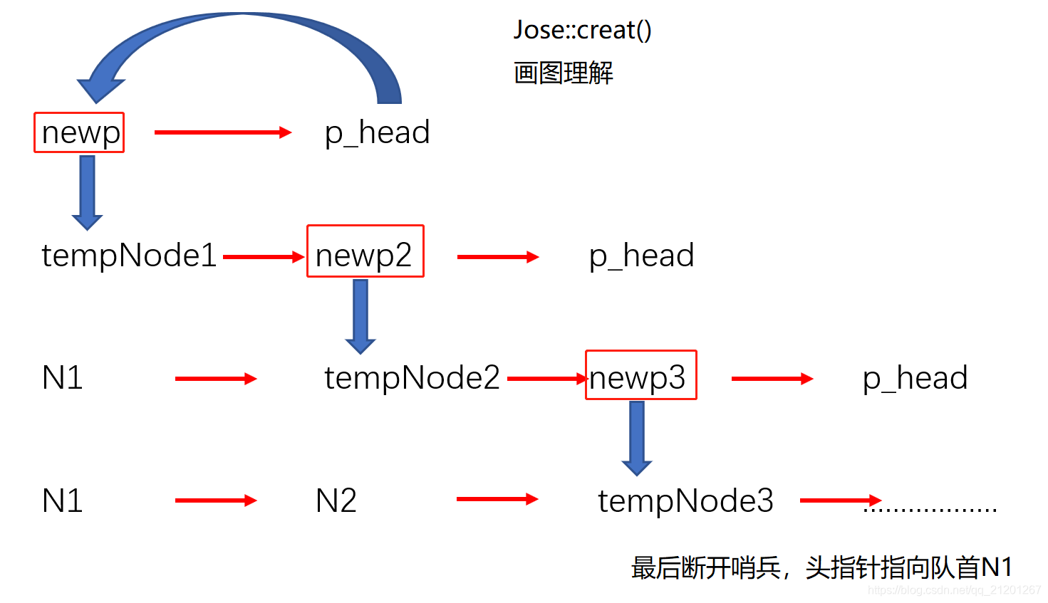 {int i = 0, n;NodeType *newp, *tempNode;tempNode = p_head;cout << "\n enter total nums of people: ";cin >> n;for(i = 0; i < n; ++i){newp = new NodeType;newp->num = i+1;cout << "\n enter name: ";cin >> newp->name;newp->next = p_head; //此处p_head为尾部哨兵tempNode->next = newp; //不断地往尾部(尾部哨兵之前)插入节点tempNode = newp;}tempNode->next = p_head->next; //断开空头哨兵delete p_head; //释放哨兵节点p_head = tempNode->next; //头结点指向第一个节点