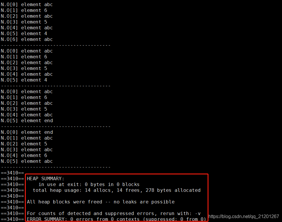 {int m = 0;LinkNode<ElemType>* tempNode = p_head;for(; tempNode != NULL; tempNode = tempNode->_next){cout << "N.O[" << m++ << "] element " << tempNode->_data << endl;}cout << "--------------------------------------" << endl;