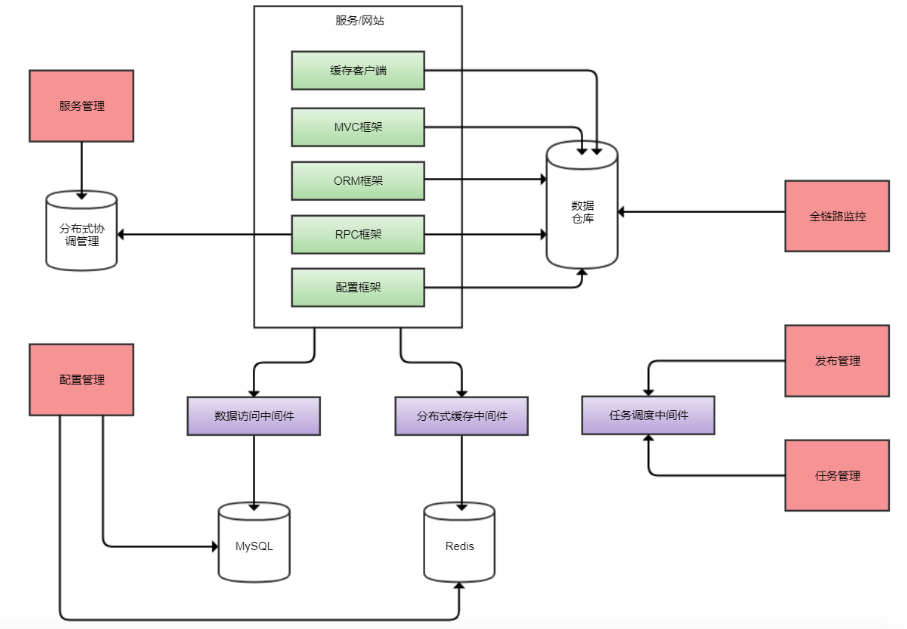 图上绿色部分代表了框架,红色部分代表了管理系统,紫色部分代表了中间件。本文会着重介绍管理系统和中间件部分。