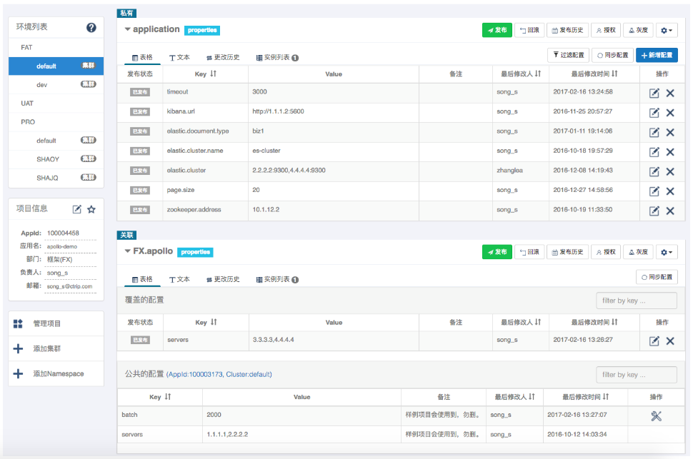 比较知名的分布式配置服务和管理系统有携程的 https://github.com/ctripcorp/apollo(上图)以及https://github.com/knightliao/disconf。对于比较大型的互联网项目来说,因为业务繁杂,需求多变,往往各种系统都会有大量的配置,覆盖几个方面: