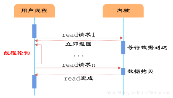 非阻塞模型是I/O方法调用(比如read)无论数据有没有就绪,会马上返回。如果有数据就会读到数据,如果没有数据就返回一个错误码。应用程序需要用轮询的方式不断去检测数据有没有就绪,但是程序不会被阻塞,除了轮询程序还可以做其他事情。但是这种轮询的方式会浪费CPU的时间,效率不够高。