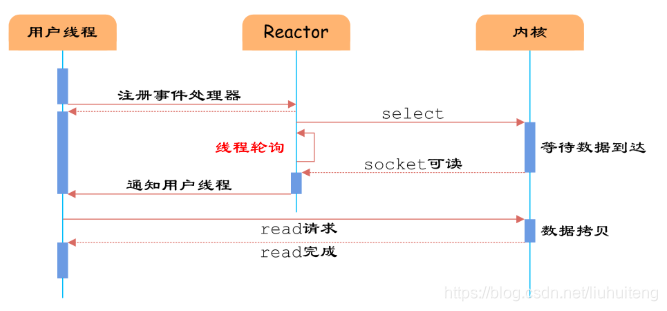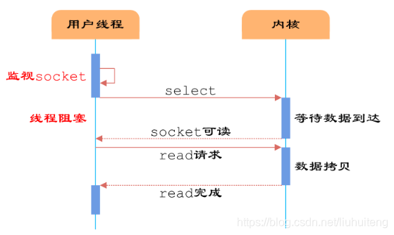 如上图《多路分离函数select》所示,用户首先将需要进行IO操作的socket添加到select中,然后阻塞等待select系统调用返回。当数据到达时,socket被激活,select函数返回。用户线程正式发起read请求,读取数据并继续执行。