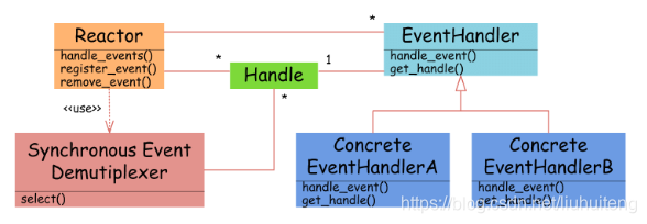 如上图《Reactor实现多路复用》所示,EventHandler抽象类表示IO事件处理器,它拥有IO文件句柄Handle(通过get_handle获取),以及对Handle的操作handle_event(读/写等)。继承于EventHandler的子类可以对事件处理器的行为进行定制。Reactor类用于管理EventHandler(注册、删除等),并使用handle_events实现事件循环,不断调用同步事件多路分离器(一般是内核)的多路分离函数select,只要某个文件句柄被激活(可读/写等),select就返回(阻塞),handle_events就会调用与文件句柄关联的事件处理器的handle_event进行相关操作。