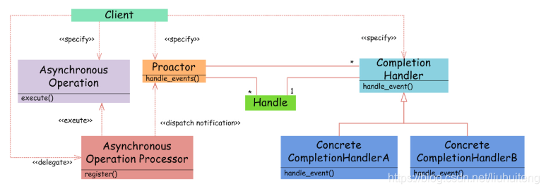 如上图《Proactor设计模式》所示,Proactor模式和Reactor模式在结构上比较相似,不过在用户(Client)使用方式上差别较大。Reactor模式中,用户线程通过向Reactor对象注册感兴趣的事件监听,然后事件触发时调用事件处理函数。而Proactor模式中,用户线程将AsynchronousOperation(读/写等)、Proactor以及操作完成时的CompletionHandler注册到AsynchronousOperationProcessor。AsynchronousOperationProcessor使用Facade模式提供了一组异步操作API(读/写等)供用户使用,当用户线程调用异步API后,便继续执行自己的任务。AsynchronousOperationProcessor 会开启独立的内核线程执行异步操作,实现真正的异步。当异步IO操作完成时,AsynchronousOperationProcessor将用户线程与AsynchronousOperation一起注册的Proactor和CompletionHandler取出,然后将CompletionHandler与IO操作的结果数据一起转发给Proactor,Proactor负责回调每一个异步操作的事件完成处理函数handle_event。虽然Proactor模式中每个异步操作都可以绑定一个Proactor对象,但是一般在操作系统中,Proactor被实现为Singleton模式,以便于集中化分发操作完成事件。
