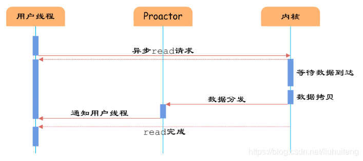 如上图《Proactor实现异步IO》所示,异步IO模型中,用户线程直接使用内核提供的异步IO API发起read请求,且发起后立即返回,继续执行用户线程代码。不过此时用户线程已经将调用的AsynchronousOperation和CompletionHandler注册到内核,然后操作系统开启独立的内核线程去处理IO操作。当read请求的数据到达时,由内核负责读取socket中的数据,并写入用户指定的缓冲区中。最后内核将read的数据和用户线程注册的CompletionHandler分发给内部Proactor,Proactor将IO完成的信息通知给用户线程(一般通过调用用户线程注册的完成事件处理函数),完成异步IO。
