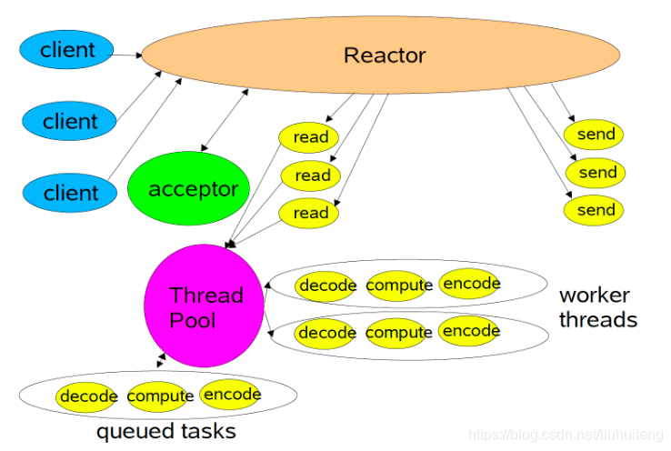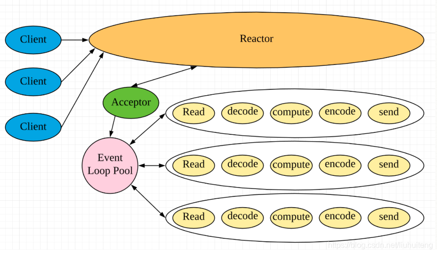 - Handler - 事件处理类,用以实现具体的业务逻辑。图中read,decode,compute,encode和send都是由handler实现的。