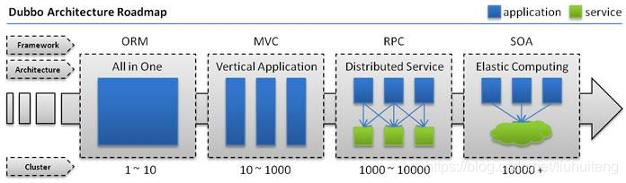 技术为业务而生,架构也为业务而出现,当然SOA和微服务也是因为业务的发展而出现。出现SOA和微服务框架与业务的发展、平台的壮大密不可分,下面借用dubbo的网站架构发展图和说明: