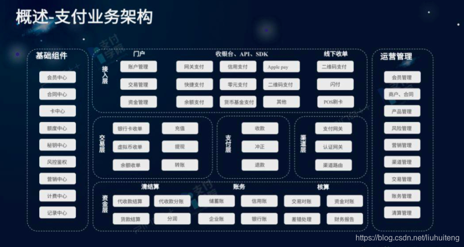 首先给大家讲一下,这个并不是一个标准的支付业务架构图,这个架构图是从财务架构的角色出发而画的。