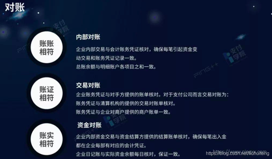 在术语上可能也不一样,比如说业务角度来说,更多时候对账也好勾兑也好,叫处理或者差错处理;但是从财务角度来说,对账会被认为是扎帐,看看帐是不是平。紧接着需要平账,把对账过程中发现不平的东西进行处理。