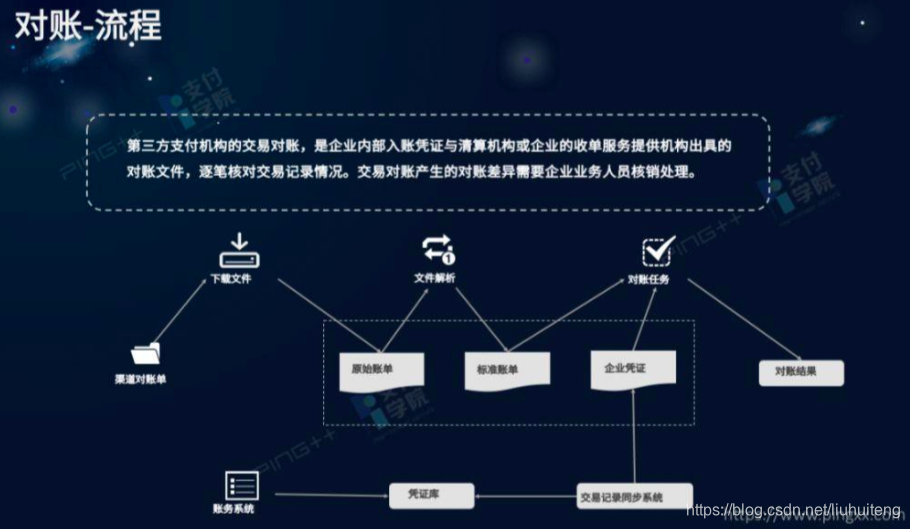 首先要通过渠道对账单进行下载、解析,做成标准的对账;然后与账务系统的凭证做勾兑,勾兑的结果最终和对账结果对比处理。