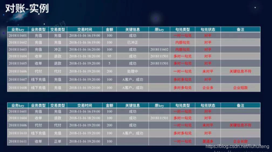 (1)、帐帐相符:因为每家支付公司都不可能只有一个系统,有很多套系统,账账相符要保证,公司内的一条交易在各个系统的状态是一致的,所表明的含义是一致的。
