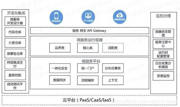 微服务应用平台的总体架构,主要是从开发集成、微服务运行容器与平台、运行时监控治理、外部渠道接入等维度来划分的。