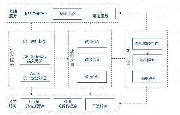 在运行期,作为一个微服务架构的平台与业务系统,除了业务应用本身外,还需要有接入服务、统一门户、基础服务等平台级服务来保障业务系统的可靠运行。图中的公共服务就是业务处理过程中需要用到的一些可选服务。