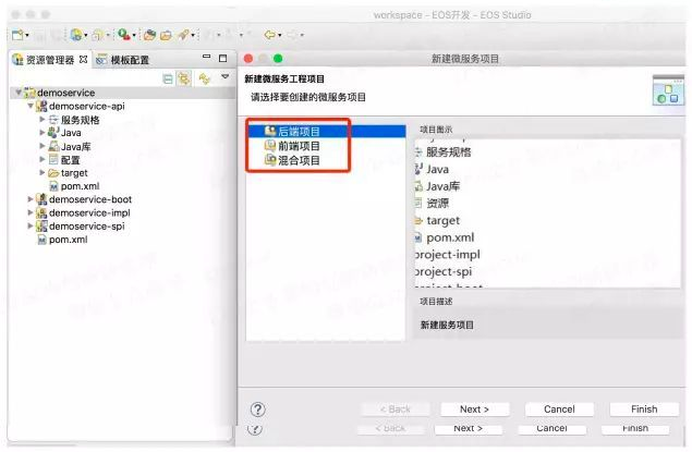 前面的设计原则中提到了一个前后端分离的原则,那么我们的开发环境中,目前支持创建前端项目、后端项目和混合项目。其中前端项目、后端项目就对应前后端分离的原则,利用平台中集成的开发工具和框架可以做到前后端开发分离,利用持续集成工具可以方便的将前端、后端项目编译打包成可独立运行的程序。混合项目则是为了兼容传统模式而保留的,为企业应用向微服务架构演进提供过渡方案。