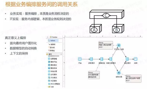 但是大家要注意,逻辑流编排的是业务流程,尽量能够简单明了,一眼看上去就明白业务含义。而业务规则推荐采用服务内部进行编码实现。千万不要将我们的 “逻辑流” 图形化服务编排完全取代程序编码,这样就会可能会走入另外一个极端,比如设计出像蜘蛛网一样的逻辑流图,简直就是灾难。