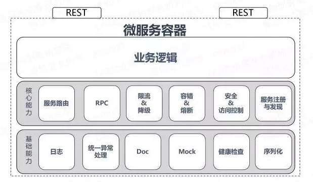 我们再来看一下微服务运行容器的一个逻辑图,大家可以看到,我们要做微服务架构的应用,可靠高效的微服务应用,实际上我们需要做的事情还是非常多的。如果没有一个统一的微服务容器,这些能力在每个微服务组件中都需要建设一遍,而且会五花八门,也很难集成到一起。有了统一的微服务运行容器和一些公共的基础服务,前面所提到的微服务架构下部分组件重复建设的问题也迎刃而解。