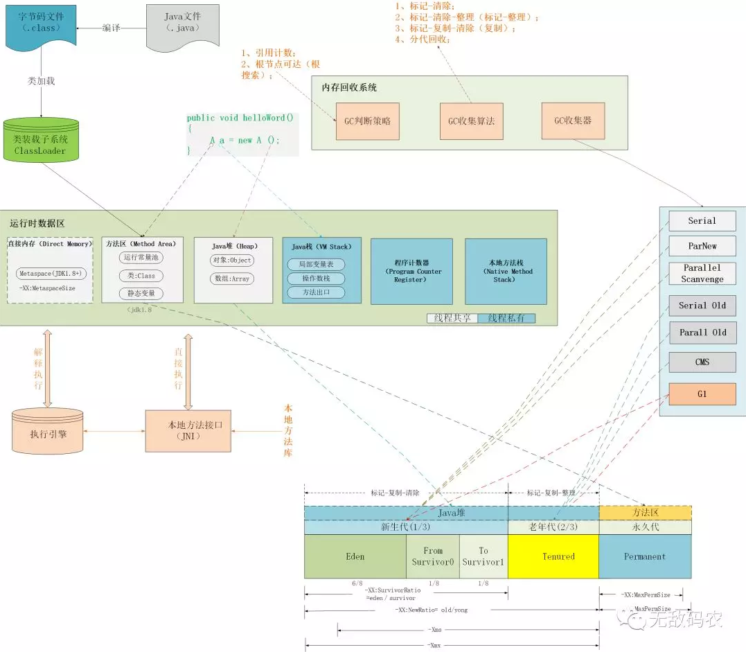 现代商用虚拟机基本都采用分代收集算法来进行垃圾回收。这种算法没什么特别的,无非是上面内容的结合罢了,根据对象的生命周期的不同将内存划分为几块,然后根据各块的特点采用最适当的收集算法。大批对象死去、少量对象存活的(新生代),使用复制算法,复制成本低;对象存活率高、没有额外空间进行分配担保的(老年代),采用标记-清理算法或者标记-整理算法。
