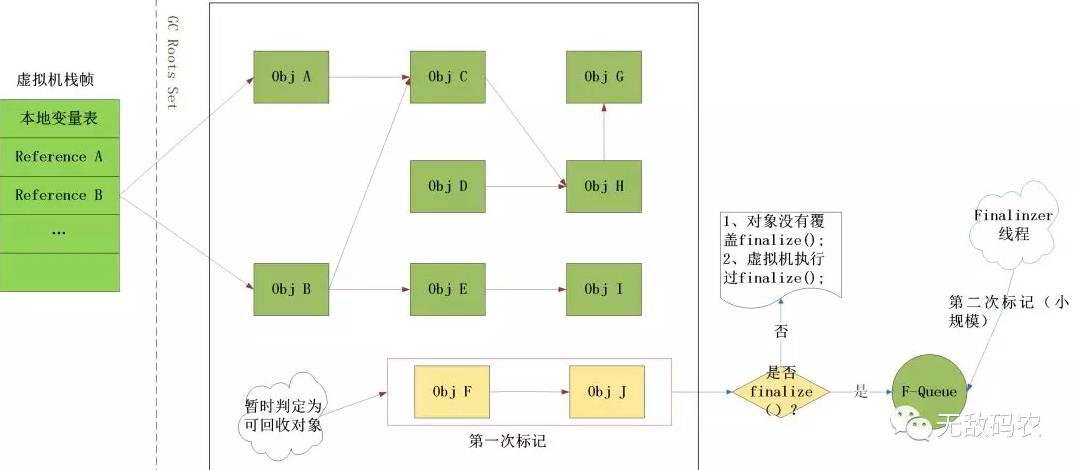 在主流的JVM中是采用“可达性分析算法”来进行判断的。此算法的基本思路就是通过一系列的称为“GC Roots”的对象作为起始点,并从这些节点开始往下进行搜索,搜索走过的路径我们称之为引用链(Reference Chain),当一个对象到GC Roots没有任何引用链相连时,我们就称之为对象引用不可达,则证明这个对象是不可用的,就可以暂时判定这个对象为可回收对象。