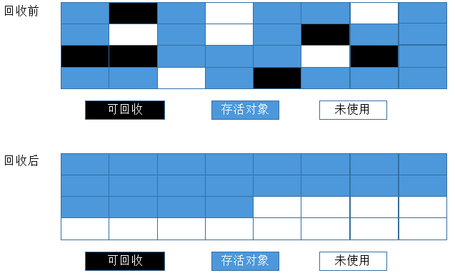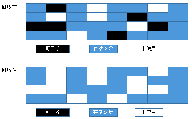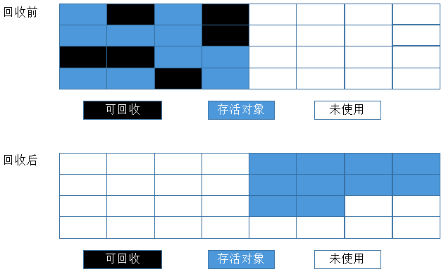 复制算法在对象存活率较高的场景下要进行大量的复制操作,效率很低。万一对象100%存活,那么需要有额外的空间进行分配担保。老年代都是不易被回收的对象,对象存活率高,因此一般不能直接选用复制算法。根据老年代的特点,有人提出了另外一种标记-整理算法,过程与标记-清除算法一样,不过不是直接对可回收对象进行清理,而是让所有存活对象都向一端移动,然后直接清理掉边界以外的内存。