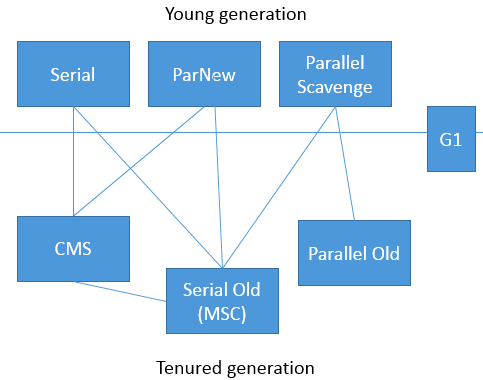 上图展示了7种作用于不同分代的收集器,如果两个收集器之间存在连线,那说明它们可以搭配使用。虚拟机所处的区域说明它是属于新生代收集器还是老年代收集器。