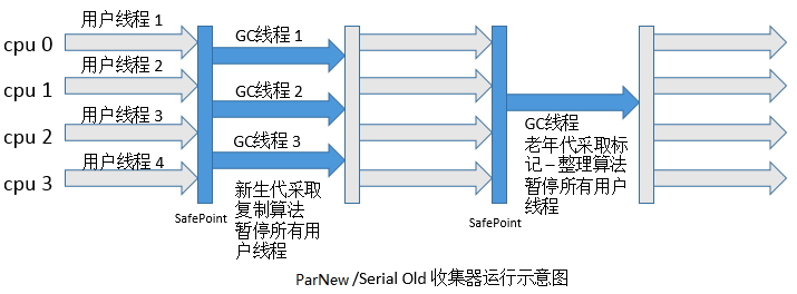 说明:1. 需要STW(Stop The World),停顿时间长。2. 简单高效,对于单个CPU环境而言,Serial收集器由于没有线程交互开销,可以获取最高的单线程收集效率。
