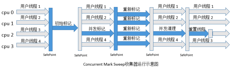 CMS(Conrrurent Mark Sweep)收集器是以获取最短回收停顿时间为目标的收集器。使用标记 - 清除算法,收集过程分为如下四步: