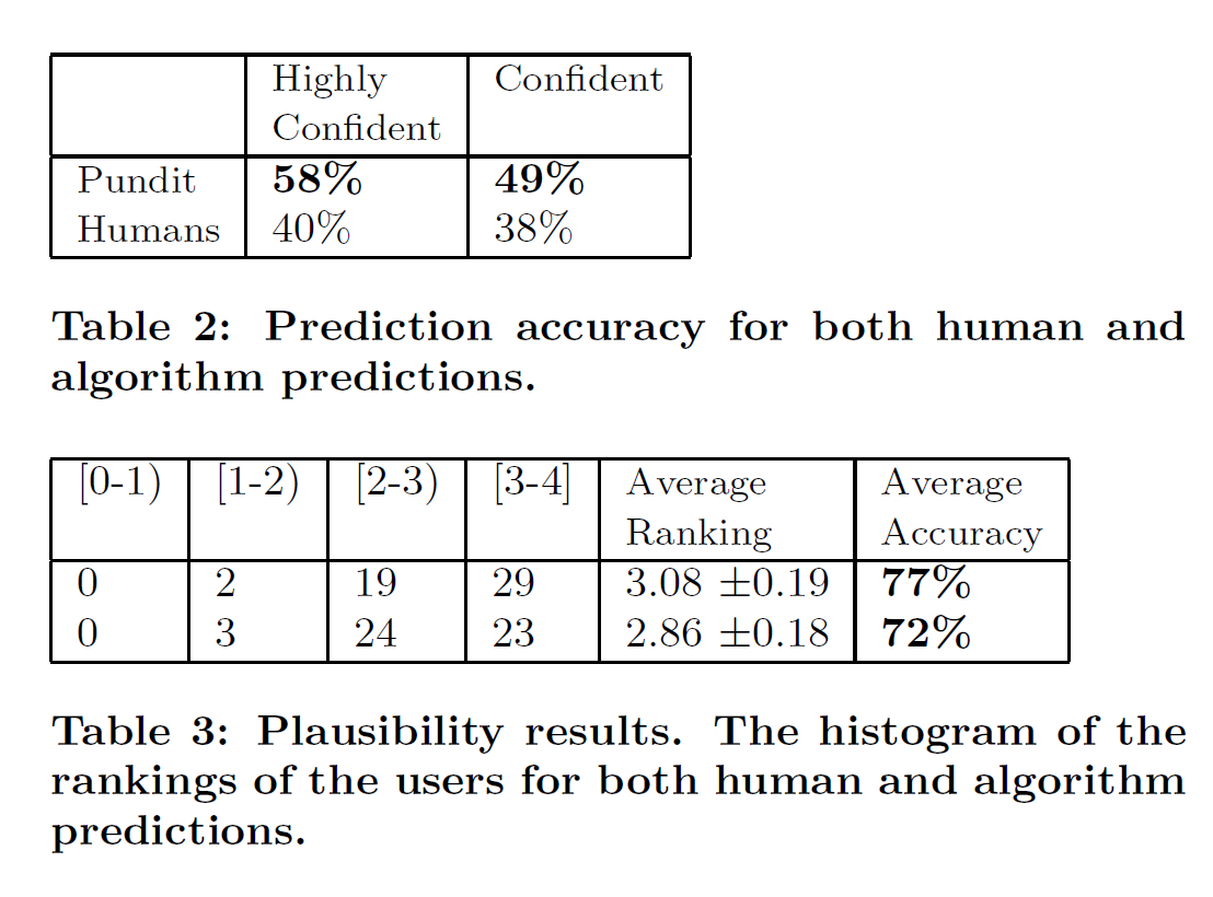 表2中报告了准确度评估结果。尽管Pundit的表现较高,但对k个配对得分的配对t检验得出非统计学显着的p值(0.08)。结果提供了一些证据,证明该算法预测未来事件的能力与人类预测能力的能力相似。