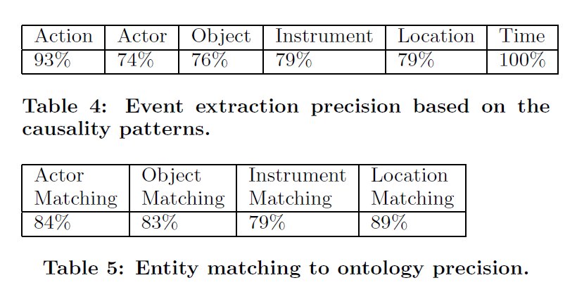 对于每个提取的因果关系事件,我们计算了事件结构的语义提取的精度(表4)。我们得出结论,使用我们使用的模板在该域中提取事件具有相当高的精度。为了比较,用于提取不同类型关系的实体的其他工作[7]达到42-53%的精度。如此高精度的主要原因是使用特定于域的模板以获得高精度(具有较低的召回率)。我们进行了额外的实验,以评估基于语义相似性的上述每个实体与世界知识本体的匹配。结果总结在表5中。