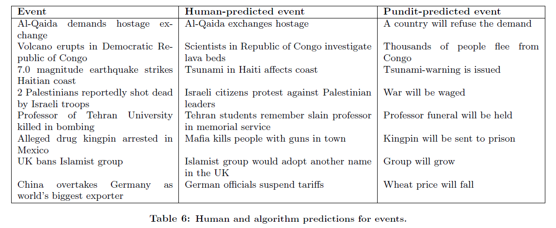 另一个例子是,给定事件“6.1级大地震袭击海地”,它输出了以下预测:“[人数]将会死亡”,“[人数]将失踪”,“[人数]余震将在海地附近袭击海岛”和“地震将转向美属维尔京群岛”。虽然前三个预测似乎非常合理,但第四个预测是有问题的。在这种情况下,系统学到的规则是 :袭击岸边国家的自然灾害倾向于靠近国家。在我们的案例中,它预测地震将影响美属维尔京群岛,这些岛屿在地理上与海地关系密切。然而,预测“地震将转向美属维尔京群岛”并不是很现实,因为地震不能改变它的路线。它的创建基于与龙卷风袭击海岸国家的过去例子的匹配。原因是训练的稀疏性。两者都是自然灾害,没有负面的例子或足够的积极例子来支持这种区分。然而,我们仍然觉得这个例子很有意思,因为它使用空间位置发布预测(美国维尔京群岛[靠近]海地)。同样问题的另一个例子是预测:<闪电杀死了5人,闪电将被捕>,这是基于训练例子预测的,在示例中杀害其他人的人被捕。表6中可以看到测试中超过50个的更多示例。
