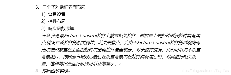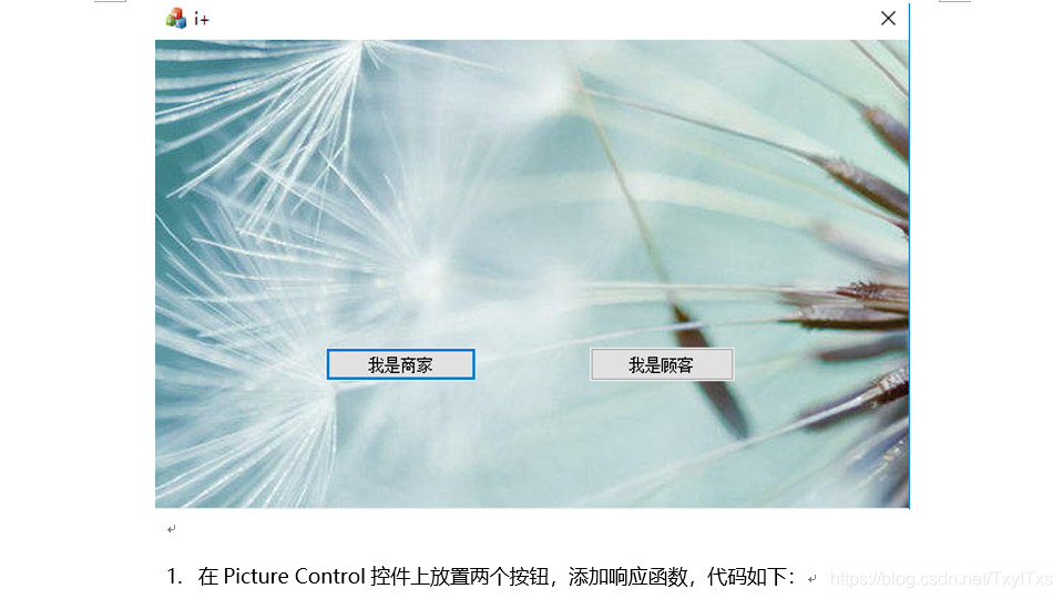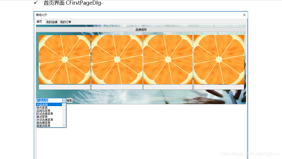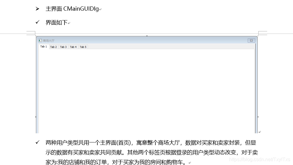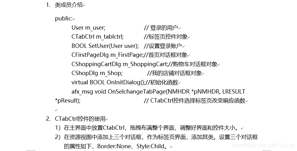 {CDialogEx::OnInitDialog();// TODO: 在此添加额外的初始化//设置标签页页头,根据用户类型动态设置m_tablctrl.InsertItem(0, _T("首页"));if (m_user.m_UserType== _T("商家")){m_tablctrl.InsertItem(1, _T("我的店铺"));m_tablctrl.InsertItem(2, _T("我的订单"));}else if (m_user.m_UserType == _T("顾客")){m_tablctrl.InsertItem(1, _T("我的房间"));m_tablctrl.InsertItem(2, _T("购物车"));}//标签控件位置设置CRect si;m_tablctrl.GetClientRect(&si);CRect it;m_tablctrl.GetItemRect(0, it);si.top += it.top + 20;si.left += 5;si.bottom -= 5;si.right -= 5;m_FirstPage.Create(IDD_FIRST_PAGE, &m_tablctrl);m_FirstPage.MoveWindow(&si);if (m_user.m_UserType == _T("商家")){