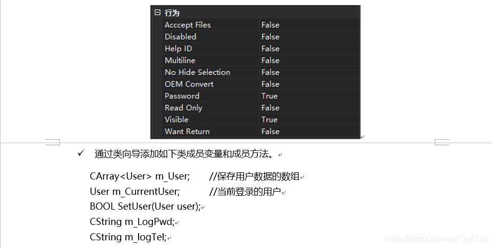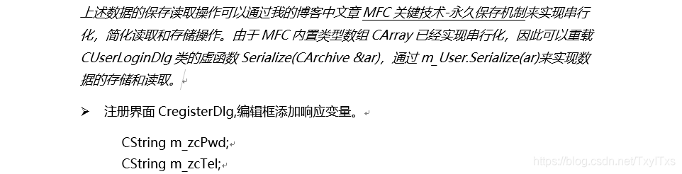 {CDialogEx::OnInitDialog();// TODO: 在此添加额外的初始化CFile o; if (o.Open(_T("userdata.txt"), CFile::modeRead)){CArchive ar(&o, CArchive::load);CString line=NULL;do{ ar.ReadString(line); //读出一行数据line.TrimRight();line.TrimLeft(); //去除左右空格if (line == _T(""))break;//数据项拆分,构造数据对象User u;AfxExtractSubString(u.m_TelNum, line,1, ',');AfxExtractSubString(u.m_Pwd, line,2, ',');AfxExtractSubString(u.m_UserType, line,3, ',');m_User.Add(u);} while (TRUE);ar.Close();o.Close();}return TRUE; }