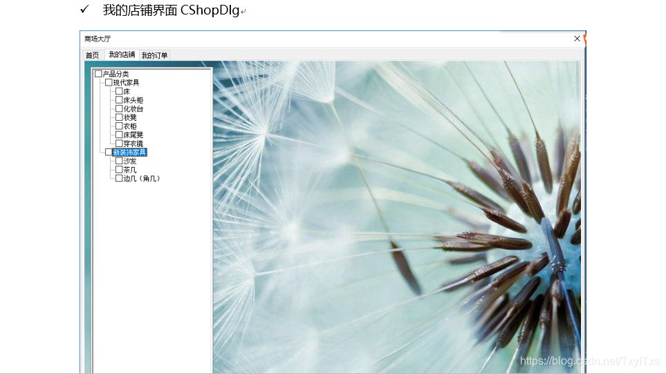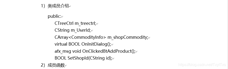 {CDialogEx::OnInitDialog();// TODO: 在此添加额外的初始化HTREEITEM hRoot; // 根节点HTREEITEM hgood;HTREEITEM h;hRoot = m_treectrl.InsertItem(_T("产品分类"), 0, 0);hgood = m_treectrl.InsertItem(_T("现代家具"), 1, 1, hRoot, TVI_LAST); h = m_treectrl.InsertItem(_T("床"), 1, 1, hgood, TVI_LAST);h = m_treectrl.InsertItem(_T("床头柜"), 1, 1, hgood, TVI_LAST);h = m_treectrl.InsertItem(_T("化妆台"), 1, 1, hgood, TVI_LAST);h = m_treectrl.InsertItem(_T("妆凳"), 1, 1, hgood, TVI_LAST);h = m_treectrl.InsertItem(_T("衣柜"), 1, 1, hgood, TVI_LAST);h = m_treectrl.InsertItem(_T("床尾凳"), 1, 1, hgood, TVI_LAST);h = m_treectrl.InsertItem(_T("穿衣镜"), 1, 1, hgood, TVI_LAST);hgood = m_treectrl.InsertItem(_T("新装饰家具"), 1, 1, hRoot, TVI_LAST);h = m_treectrl.InsertItem(_T("沙发"), 1, 1, hgood, TVI_LAST);h = m_treectrl.InsertItem(_T("茶几"), 1, 1, hgood, TVI_LAST);h = m_treectrl.InsertItem(_T("边几(角几)"), 1, 1, hgood, TVI_LAST);return TRUE; // return TRUE unless you set the focus to a control// 异常: OCX 属性页应返回 FALSE