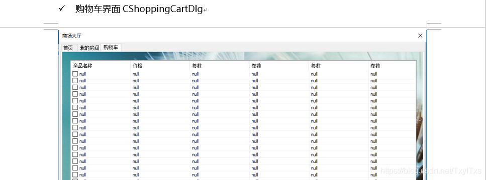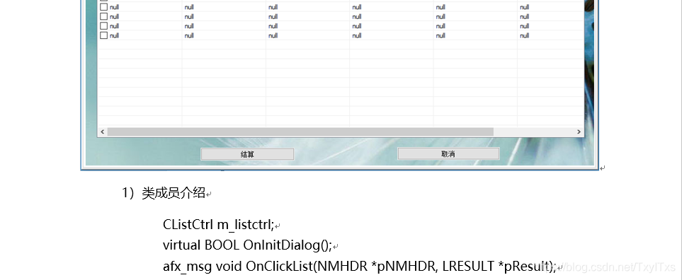 {CDialogEx::OnInitDialog();// TODO: 在此添加额外的初始化m_listctrl.SetExtendedStyle(LVS_EX_FULLROWSELECT | LVS_EX_GRIDLINES);LONG lStyle;lStyle = GetWindowLong(m_listctrl.m_hWnd, GWL_STYLE);//获取当前窗口stylelStyle &= ~LVS_TYPEMASK; //清除显示方式位lStyle |= LVS_REPORT; //设置styleSetWindowLong(m_listctrl.m_hWnd, GWL_STYLE, lStyle);//设置styleDWORD dwStyle = m_listctrl.GetExtendedStyle();dwStyle |= LVS_EX_FULLROWSELECT; //选中某行使整行高亮(只适用与report风格的listctrl)dwStyle |= LVS_EX_GRIDLINES; //网格线(只适用与report风格的listctrl)dwStyle |= LVS_EX_CHECKBOXES; //item前生成checkbox控件m_listctrl.SetExtendedStyle(dwStyle); //设置扩展风格m_listctrl.InsertColumn(0, _T("商品名称"), LVCFMT_LEFT, 150, 40);m_listctrl.InsertColumn(1, _T("价格"), LVCFMT_LEFT, 150, 40);m_listctrl.InsertColumn(2, _T("参数"), LVCFMT_LEFT, 150, 40);m_listctrl.InsertColumn(3, _T("参数"), LVCFMT_LEFT, 150, 40);m_listctrl.InsertColumn(4, _T("参数"), LVCFMT_LEFT, 150, 40);m_listctrl.InsertColumn(5, _T("参数"), LVCFMT_LEFT, 150, 40);m_listctrl.InsertColumn(6, _T("参数"), LVCFMT_LEFT, 150, 40);for (UINT i = 0; i < 20; i++){m_listctrl.InsertItem(i,_T("null"));for (UINT j = 0; j < 7; j++){m_listctrl.SetItemText(i, j,_T("null"));}}return TRUE; // return TRUE unless you set the focus to a control// 异常: OCX 属性页应返回 FALSE