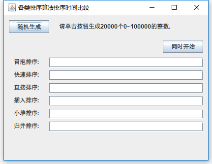 JButton c1 = new JButton("同时开始");//lab为JLabel lab = new JLabel("请单击按钮生成20000个0~100000的整数.")对象