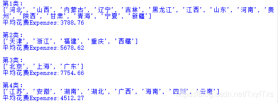 import numpy as np from sklearn.cluster import KMeansdef loadData(filePath):fr=open(filePath,'r+')lines=fr.readlines() #读取整个文件retData=[] #城市各项消费信息retCityName=[] #城市名称print(lines)for line in lines:items=line.strip().split(",") #返回城市名称,各项消费信息print(items)for item in items:it=item.strip().split(",")retCityName.append(it[0])retData.append([float(it[i]) for i in range(1,len(it))])return retData,retCityNameif __name__=="__main__":data,cityName=loadData("E:\\python\data.txt")'''所需参数:n_clusters:指定聚类中心的个数init:初始聚类中心的初始化方法max_iter: 最大迭代次数'''km=KMeans(n_clusters=4,max_iter=1000)label=km.fit_predict(data) #计算簇中心,以及为簇分配序号expenses=np.sum(km.cluster_centers_,axis=1) #每个簇求和print(expenses)CityCluster=([],[],[],[]) #将城市按label分成设定的簇for i in range(len(cityName)):CityCluster[label[i]].append(cityName[i]) #将每个簇的城市输出for j in range(len(CityCluster)):print("第%d类:"%(j+1))print(CityCluster[j])print("平均花费Expenses:%.2f\n"%expenses[j]) #每个簇的平均花费输出''' expense:聚类中心点的数值加和,即平均消费水平拓展和改进计算两条数据相似性时,skleande k-Means默认用的欧式距离。虽然还有余弦距离,马氏距离等多种方法,但没有设定距离方法的参数。可以更改源代码:建议使用scipy.apatial.distance.cdistscipy.apatial.distance.cdist(A,B,metric="cosine")使用余弦距离'''