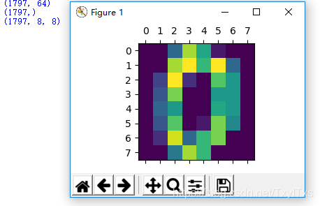 #手写数字数据集 from sklearn.datasets import load_digits digits=load_digits() ''' #加载数据集, #参数:return_X_y:若为True,则以(data,target)形式返回,默认为False,表示以字典形式返回数据全部信息(data和target)n_class:表示返回数据的类别数, ''' print(digits.data.shape) #打印数据维度 print(digits.target.shape) print(digits.images.shape) import matplotlib.pyplot as plt#显示图片 plt.matshow(digits.images[0]) plt.show()