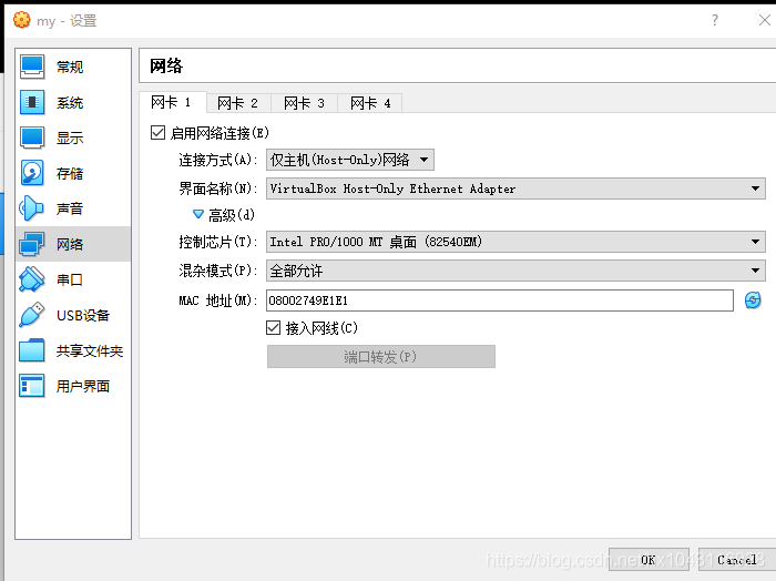 ①打开虚拟机的设置,找到网络设置。再启用网卡1,选择连接方式为Host-only,界面名称选择VirtualBox Host-Only Ethernet Adapter,设置如下图