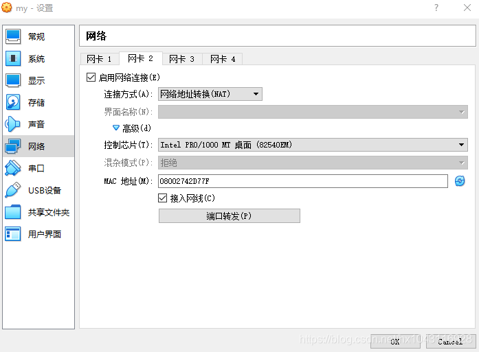 ②再启用网卡2,连接方式选择网络地址转换(NAT)即可,如下图