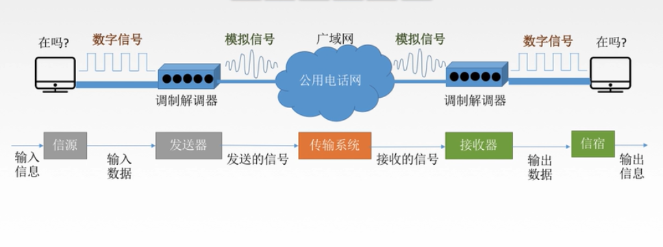 例如:我计算机发 在吗 ,电话线发出来是01011100, 调制解调器把数字信号转为模拟信号发到广域网