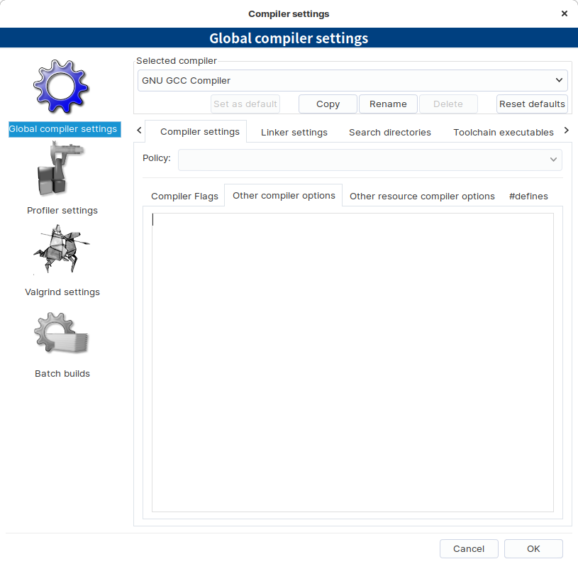 2、打开Settings->Complier,在GNU GCC Compiler的Compiler settings下有一个Other compiler options,如果里面含有内容,将其删除;