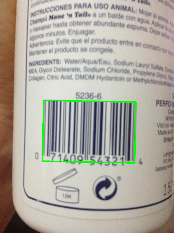 OpenCV中提供了识别图像区域的函数,非常好用,找相应的区域,根据区域大小进行排序,保留最大的区域,该区域就是我们要找的条形码区域。计算该轮廓的旋转边界框,确定位置信息,画出检测框。