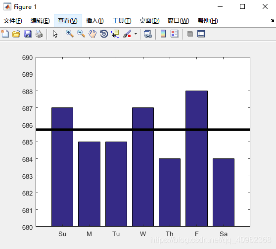 例16、统计1601年1月到2000年12月,每月的13日分别出现在星期日、星期一、星期二,...,星期六的频数,并画出对应的柱状图。注:Matlab中weekday的1对应“星期日”,2对应“星期一”,......,7对应“星期六”。