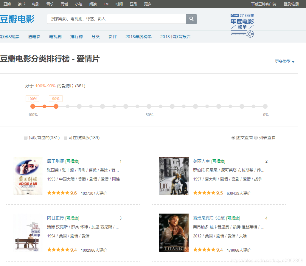 - URL中的interval_id=100%3A90表示的是评价在前10%的电影;